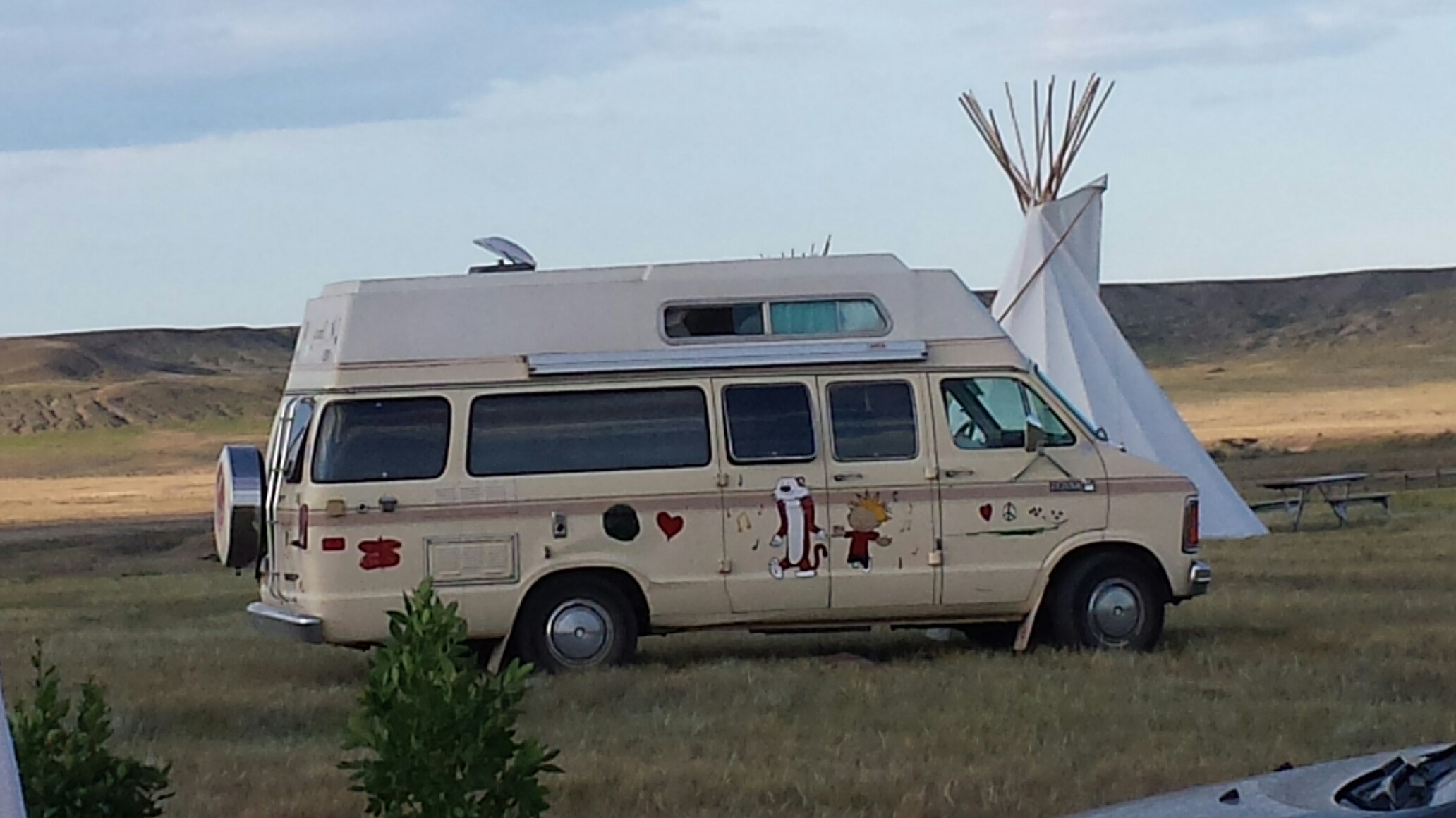 There are a limited number of camping pads at the site, but the difference between the on-pad camping and overflow is minimal. The on-pad campsites are level gravel (as opposed to the level prairie a few feet away! Lol) and there is a hook for hanging a lantern, a picnic table and a fire pit, and electrical. With a long enough extension cord, you could possibly plug into someone’s electrical box. I asked my camping neighbour if I could charge my cell phone at their site… I left it there to charge and went to have breakfast. A sprinkling of rain came through, but I had forgotten about my phone sitting on the box! When I came back, my neighbours had put my phone in a zip lock bag for me! How very Canadian! Thank you!!